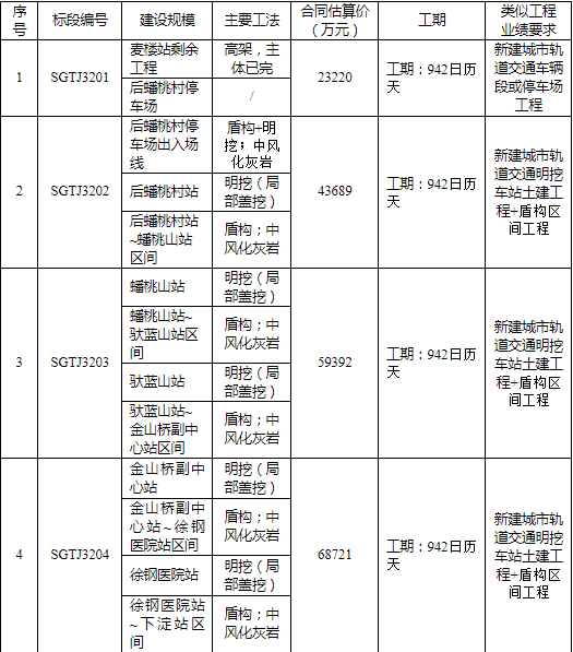 徐州市轨道交通3号线二期工程的招标公告 一、所属行业:市政 二、招标人:徐州市城市轨道交通有限责任公司 三、项目总投资:195022万元。 四、项目概况: 徐州市轨道交通3号线二期工程全线线路长约6.5km,分南北两段,共设6座车站;换乘车站2座,分别为驮蓝山路站、徐钢医院站。北段设站5座:后蟠桃村站、蟠桃山站、驮蓝山路站、金山桥副中心站、徐钢医院站,均为地下站;北段线路东起于后蟠桃村站,途径驮蓝山路、蟠桃山路、下淀路接至一期工程起点站下淀站。南段设站1座:麦楼站;南段线路利用既有银山车辆段出入线运营,在车辆段东侧设置一座高架站麦楼站。 徐州市轨道交通3号线二期工程线路平均站间距为1.30公里,最大站间距2074米,最小站间距885米。设后蟠桃村停车场1座。主变电所利用一期工程的2座主变电所。控制中心设置于1号线一期工程一号路站控制中心内。 五、标段划分: 本批次招标共分为4个标段,详细情况见下表: 六、计划工期:942日历天。 七、资格预审文件的获取: 本公告发布时间为2020年 8 月 26 日至2020年 9 月 7 日。本工程资格预审文件通过网上发出,请申请人在上述时间内登陆徐州电子化招投标系统(http://218.3.177.168/xzhynew)下载。 公告发布时间:2020年08月24日 来源:江苏省建设工程招标网 链接:http://www.jszb.com.cn/jszb/YW_info/ZhaoBiaoGG/ViewReportDetail.aspx?RowID=734266&categoryNum=012&siteid=1