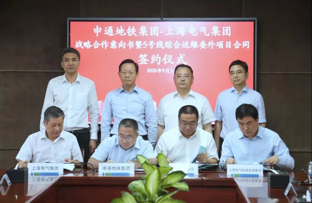 9月3日下午,申通地铁集团与上海电气集团签署战略合作意向书及上海轨道交通5号线多专业综合运维项目合同。申通地铁集团党委书记、董事长俞光耀,党委副书记、总裁毕湘利,上海电气集团党委书记、董事长郑建华,党委副书记、总裁黄瓯出席签约仪式。根据战略合作意向,双方将通过密切合作,组建合资公司,共同推进深化基于智能运维技术支持的全寿命周期多专业综合维保、关键零部件供应链合作和维修、长三角区域轨道交通运维市场协同、专业人才培养及党建联建等领域的全面合作。充分发挥“上海服务”和“上海制造”在轨道交通领域的叠加效应,推动先进制造业与现代服务业有机融合,实现资源共享、优势互补,进一步提高上海轨道交通超大规模网络运营的安全性、可靠性与运行效率,为乘客提供更加安全和便捷的出行服务。同时,双方将创新体制,积极开拓中运量有轨电车、市域(城际)铁路等维保市场,携手打造专业化、集约化、市场化的维保新模式,立足上海、服务长三角,主动融入“一带一路”国家战略。