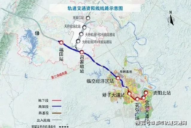 轨道交通资阳线(以下简称资阳线)是连接成都天府国际机场、天府国际空港新城和资阳市的轨道交通快线。该线路起于天府国际机场南侧的成都轨道交通18号线福田站,止于成渝客专资阳北站,采用地面、高架和地下相结合的敷设方式,列车最高运行时速140公里,预留时速160公里条件。线路全长约38.69公里,共设置车站7座,其中高架站3座(福田站、吕家咀站、临空经济区站),地下站4座(娇子大道站、苌弘广场站、宝台大道站、资阳北站),全线估算总投资约133.84亿元。根据目前各项工作的推进进度,拟于2020年12月底前开工建设,预计2024年底通车试运营。