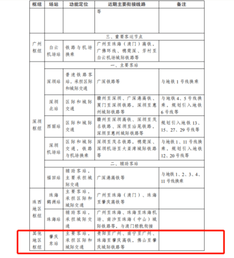 2020年7月30日,国家发改委印发《关于粤港澳大湾区城际铁路建设规划的批复》,明确提出打造肇庆东站、珠三角枢纽机场站两大枢纽。