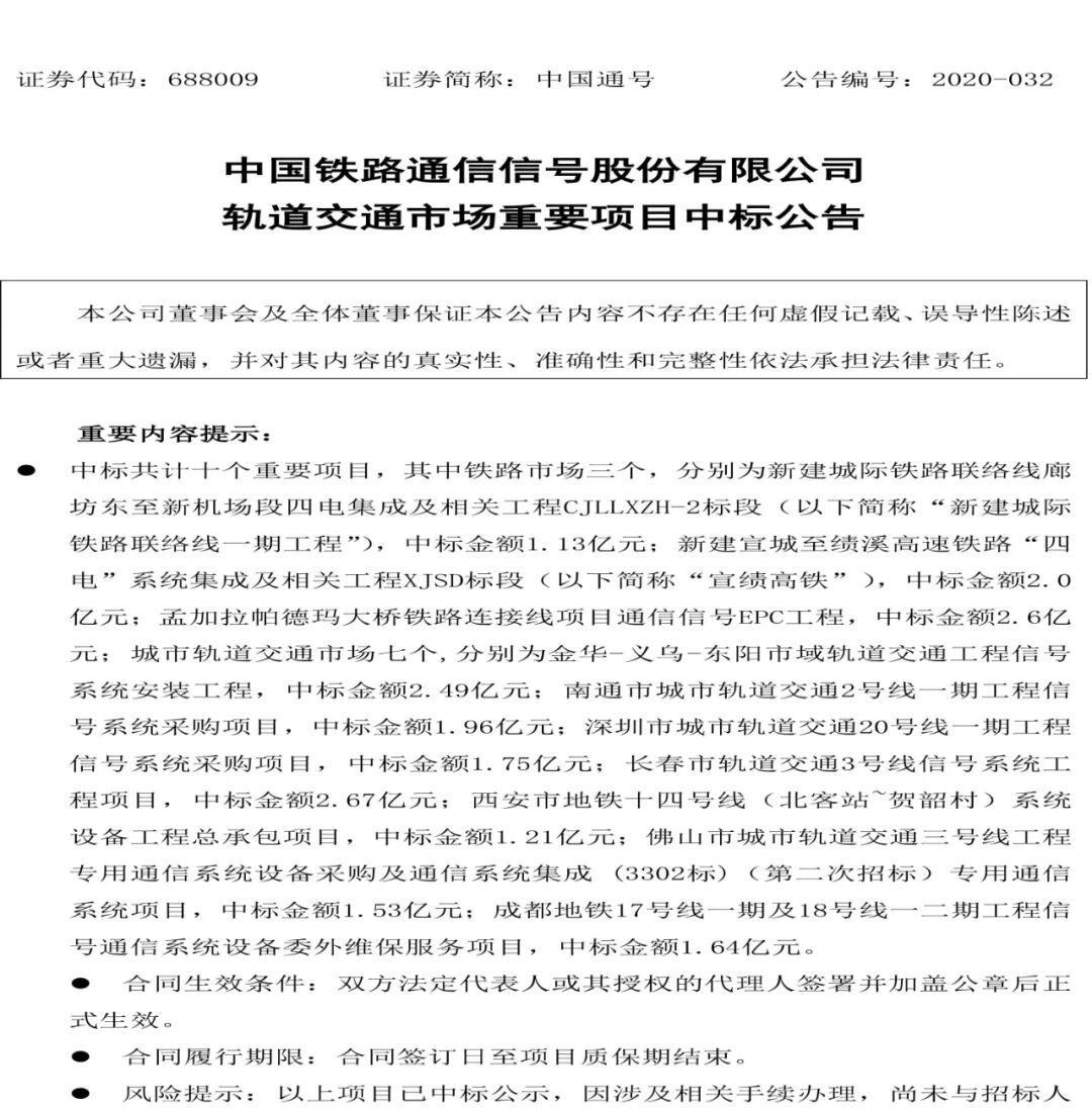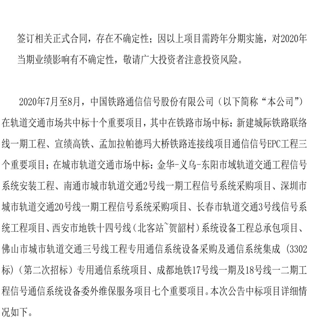 深圳市城市轨道交通20号线一期工程信号系统采购项目,中标金额1.75亿元;