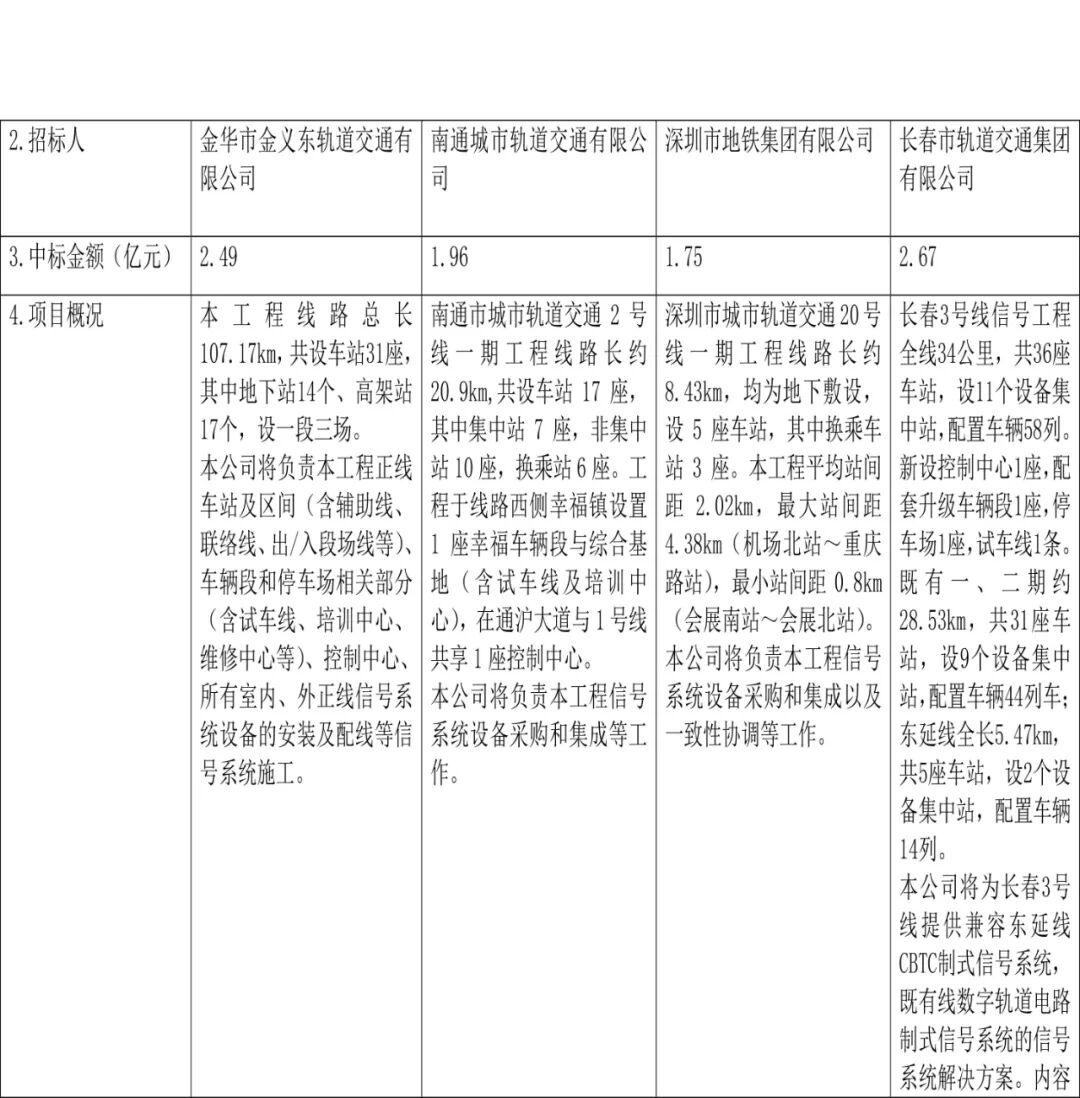 长春市轨道交通3号线信号系统工程项目,中标金额2.67亿元;