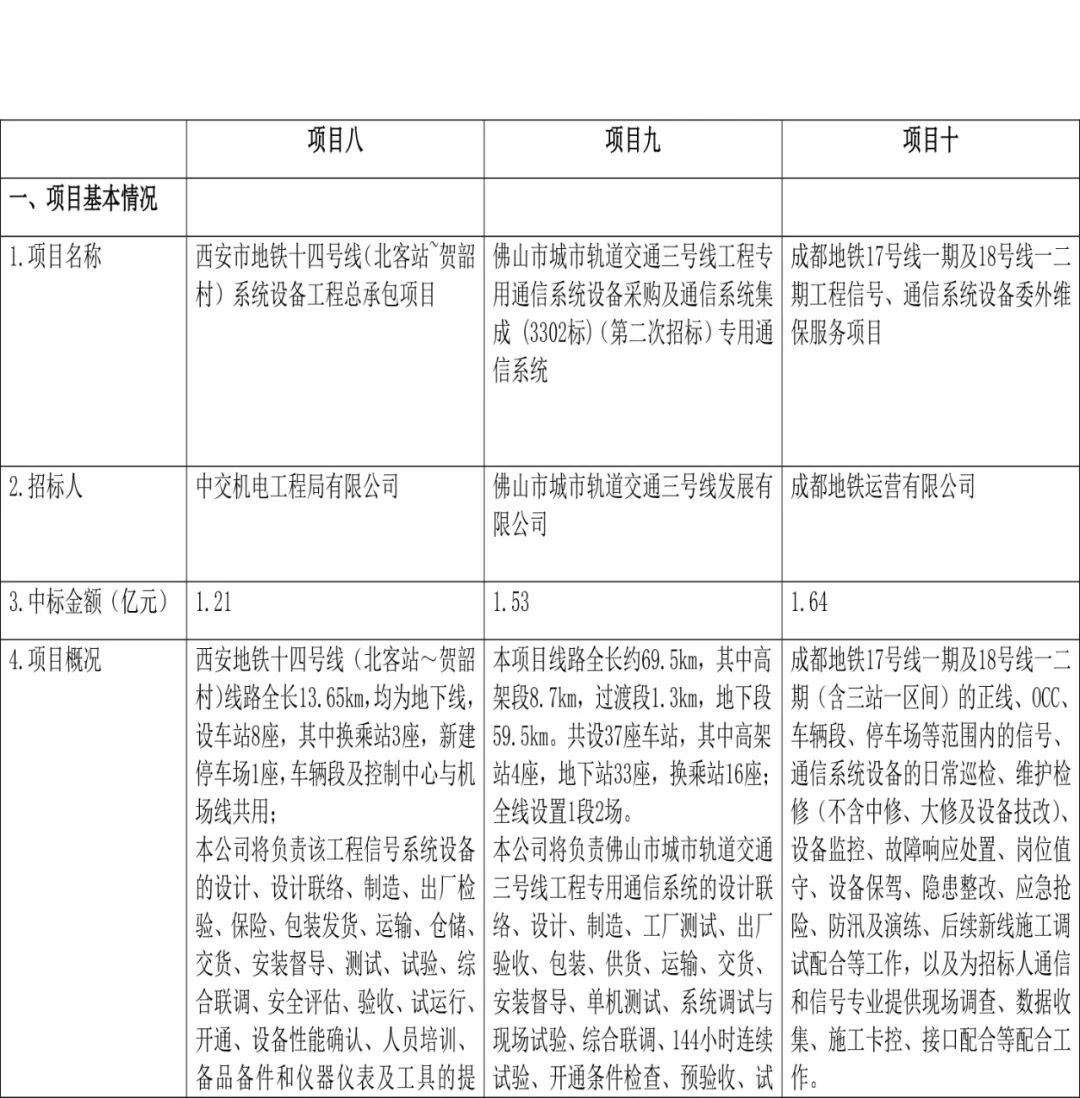 佛山市城市轨道交通三号线工程专用通信系统设备采购及通信系统集成 (3302标)(第二次招标)专用通信系统项目,中标金额1.53亿元;