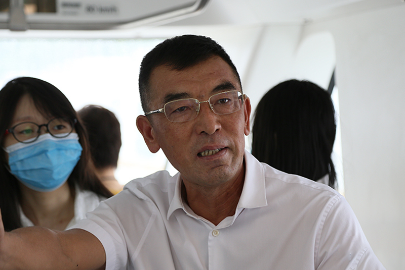 武汉中车长客轨道车辆公司董事长、总经理李宝安介绍武汉轨道交通装备制造基地生产情况。