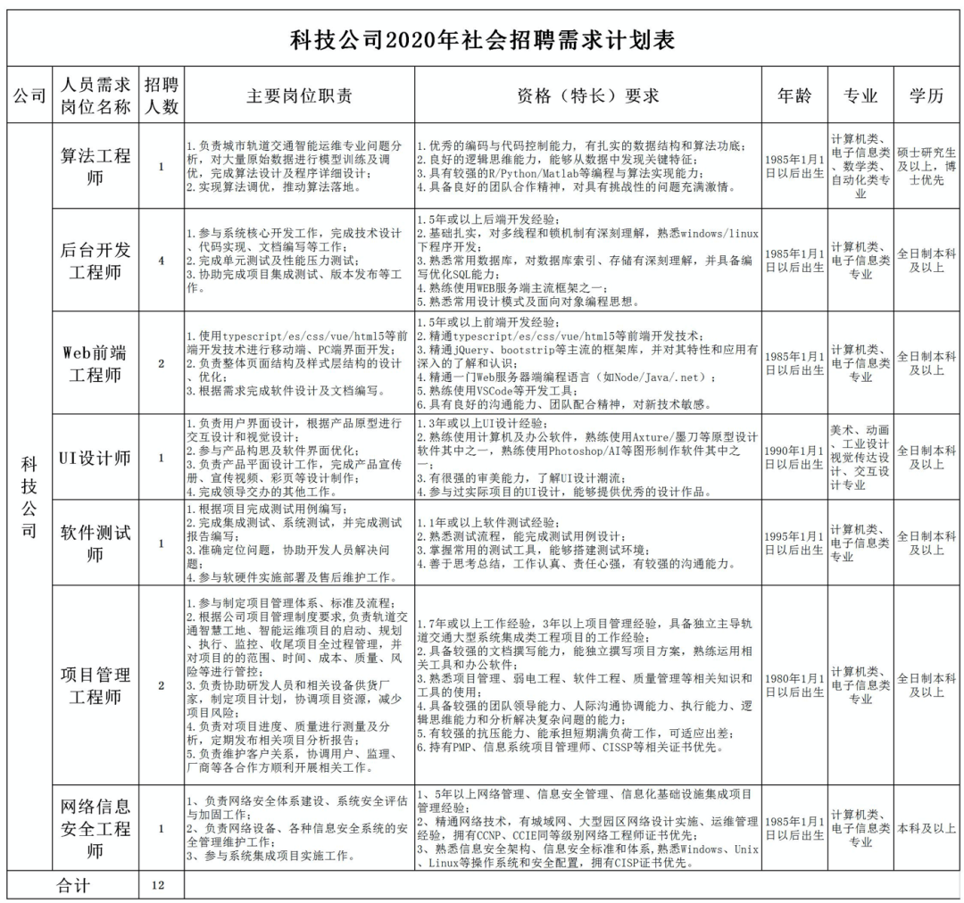 青岛地铁科技公司定位为高新技术企业,以“创新让地铁更智慧”为发展理念,以地铁信息化、智能化、智慧化建设和运维为目标,借力青岛地铁发展,为青岛地铁发展助力,逐步发展成为行业领先的科技创新型企业。我公司现处于初期发展阶段,员工具有广阔的发展空间和公平公正的晋升机会,同时为广大员工提供健康体检、用餐补贴、交通补贴、通讯补贴等福利待遇。因工作需要,现面向全社会范围吸纳科技创新型人才,我们将遵循公平、公正的原则择优录用,欢迎有志于青岛地铁科技事业的优秀人才积极报名应聘。相关招聘事宜如下: