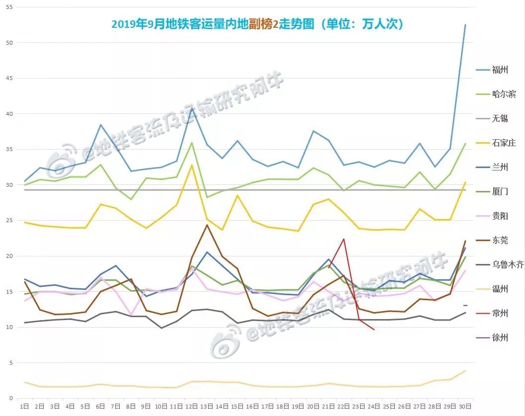 月客运量1千万~1百万:从高至低依次有哈尔滨、无锡(按日均推算)、石家庄、兰州、厦门、常州(新开通城市,按日均推算)、贵阳、东莞、乌鲁木齐共计9家,较上月新加入了常州和贵阳。