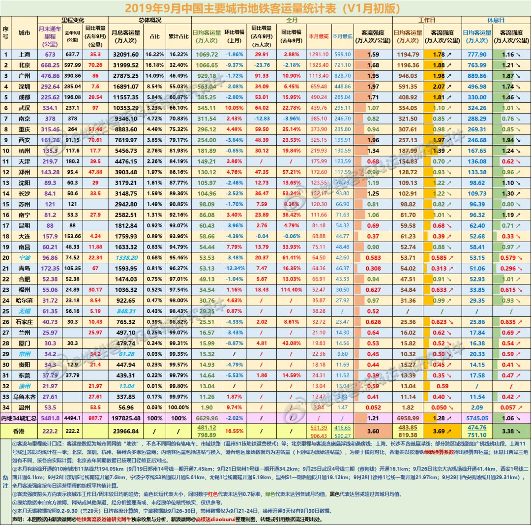 1.地域范围:包含2019年9月已开通地铁的(除有轨电车、云轨、铁路运营的市域铁路等)的内地36座城市(佛山数据列入广州)中的34座(缺长春、济南)及香港共计35座城。