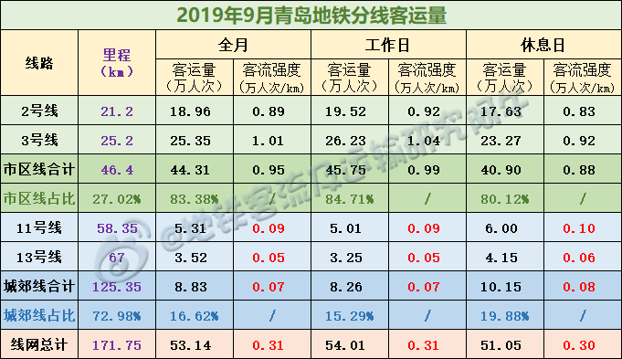 (1)青岛地铁市区线路2条,城郊区线路2条,前者以27%的里程,完成约83%的客运量;后者以73%的里程,完成约17%的客运量。