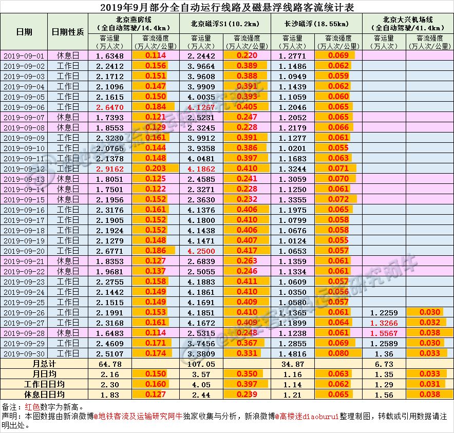 (2)磁悬浮目前中国已开通运营的有3条,上海磁悬浮为高速磁悬浮,据悉日均客流约1万余人次;北京S1及长沙磁悬浮为中低速磁悬浮,也特关注并列出其客流,其中北京燕房线9月共2次创历史新高,S1线9月共3次创历史新高,大兴机场线2次创历史新高(数字标红)。