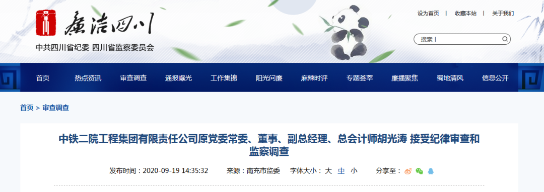 中铁二院工程集团有限责任公司原党委常委、董事、副总经理、总会计师胡光涛涉嫌严重违纪违法,目前中国铁路工程集团有限公司纪委正对其进行纪律审查,经四川省监委指定管辖,南充市监委正对其进行监察调查。