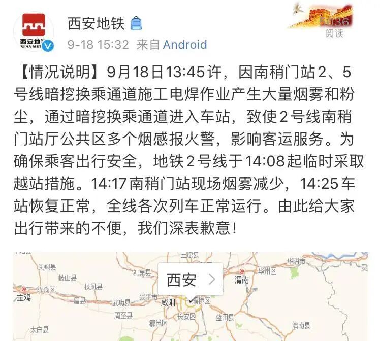 【情况说明】9月18日13:45许,因南稍门站2、5号线暗挖换乘通道施工电焊作业产生大量烟雾和粉尘,通过暗挖换乘通道进入车站,致使2号线南稍门站厅公共区多个烟感报火警,影响客运服务。为确保乘客出行安全,地铁2号线于14:08起临时采取越站措施。14:17南稍门站现场烟雾减少,14:25车站恢复正常,全线各次列车正常运行。由此给大家出行带来的不便,我们深表歉意!
