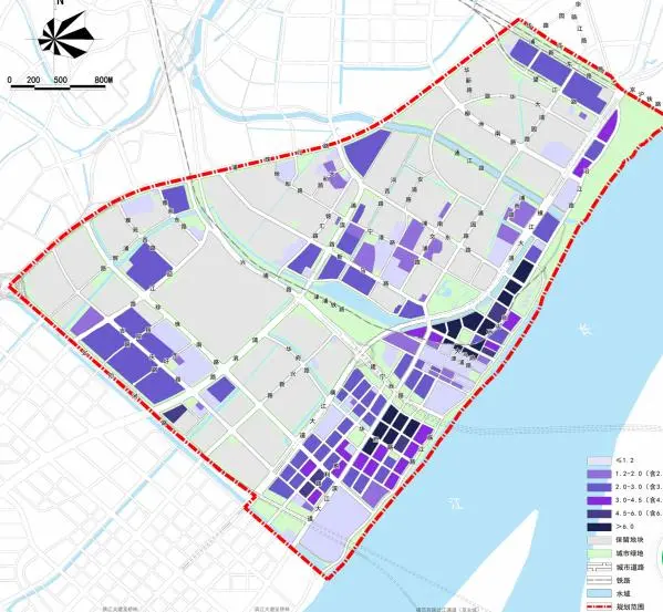 开发强度分6级管控。- -级强度分区≤1.2,主要为浦口火车站历史风貌区、中小学及市政设施用地;二级强度分区1.2~2.0,主要为浦口火车站历史风貌区两侧用地及横江大道以西居住用地;三级强度分区2. 0~3.0,主要为横江大道以东居住用地及大管河以北商住混合用地;四级强度分区3.0~4.5,五级强度分区4.5~6.0,六级强度分区>6.0,主要为横江大道以东的商办混合、商住混合用地。