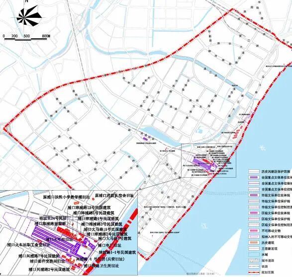 规划区历史文化保护对象包括1处历史风貌区,即浦口火车站历史风貌区;1处全国重点文物保护单位,即浦口火车站及其附属建筑;3处市级文物保护单位,即浦口铁路轮渡桥、浦口电厂旧址、津浦铁路浦口机务段英式建筑; 1处区级文物保护单位,即侵华日军浦口战俘营“抗日蒙难将士纪念碑”; 18处不可移动文物,即大马路1号建筑等; 5处历史建筑,即兴浦路4号民居等。