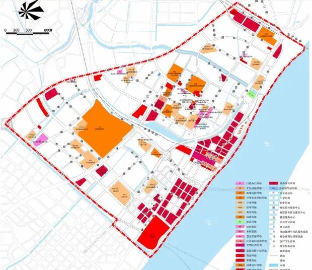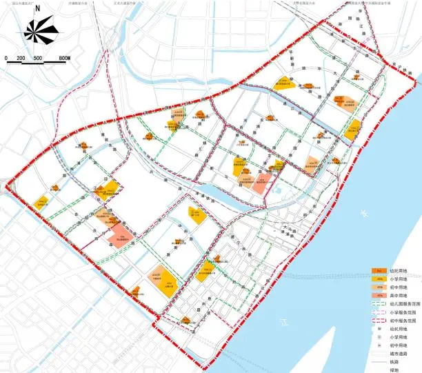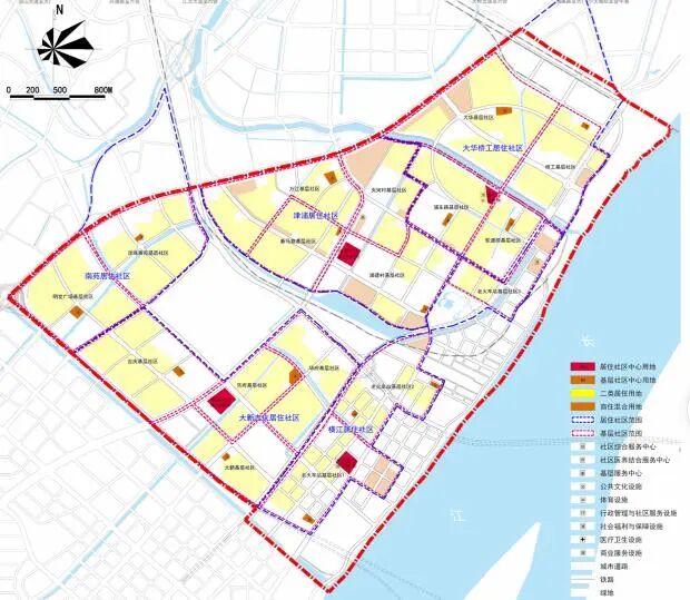 规划公共管理与公共服务设施用地148.87公顷,占城市建设用地的12.90%。,其中,行政办公用地6.43公顷、文化设施用地5.77公顷、教育科研设施用地,121.50公顷、体育用地1.30公顷、医疗卫生用地1.91公顷、社会福利用地0.17公顷、文物古迹用地4.73公顷、居住社区中心用地7.06公顷。此外,规划商业服务业设施用地,125.35公顷,主要分布在横江大道以东滨江片区。规划居住社区中心4处,占地7. 06 .公顷,包括大华桥工、津浦、大新吉庆和横江居住社区中心,南苑居住社区中心位于基地外。