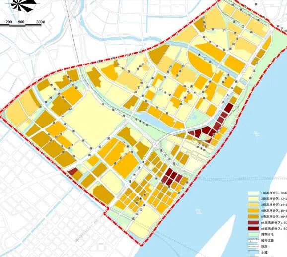 建筑高度分6级管控。一级高度分区≤12米,主要为浦口火车站历史风貌区及市政设施用地;二级高度分区12~24米,主要为教育科研、行政办公及部分现状居住用地;三级高度分区24~35米,主要为部分现状居住用地;四级高度分区35~60米,五级高度分区60~100米,主要为部分居住用地及商业服务业设施用地;六级高度分区100~250米,主要为横江大道以东、规划地铁站周边的商办混合用地