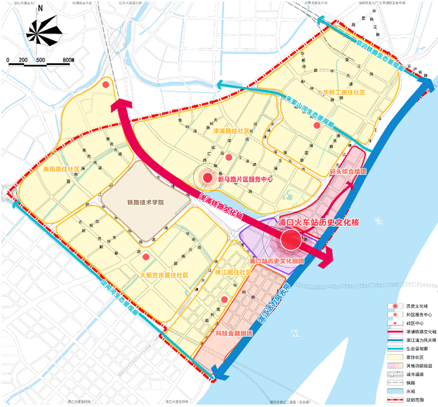 南京江北新区浦口火车站地区包括津浦铁路文化公园、创意先锋区、乐活新社区三大特色功能,打造凸显历史文化,融合商业商务、文化休闲、品质宜居等多功能为一体的滨江活力综合组团。规划形成“一轴、一带、三廊,一核、一心、多组团”的空间结构。◆“三廊”包括朱家山河、定向河、京沪铁路生态景观廊;◆“多组团”包括科技金融组团、浦口站历史文化组团、码头综合组团、铁道技术学院及5个居住社区。