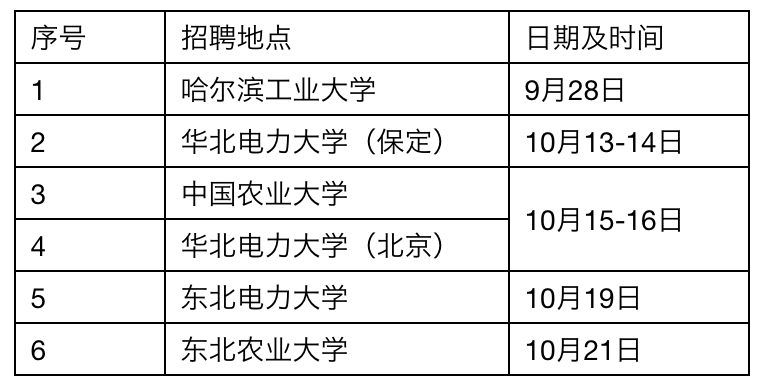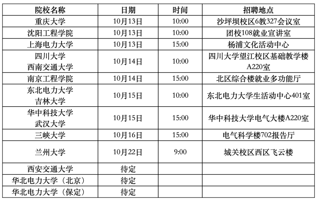 本批校园招聘将于10月13日开始,具体行程如下,如有变更,在国网招聘平台动态更新。符合招聘条件的高校毕业生可就近选择参加。