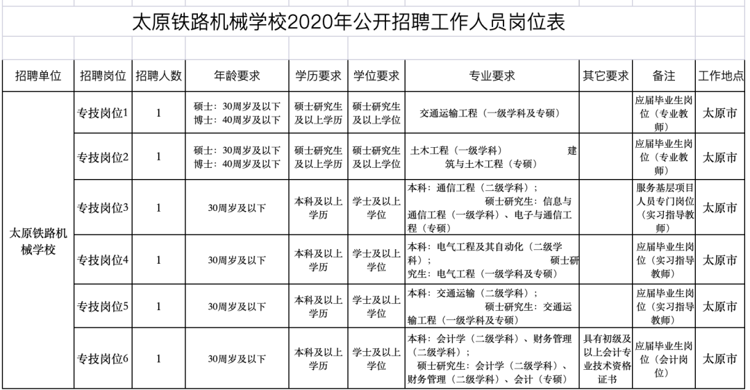 太原铁路机械学校2020年公开招聘工作人员6名,招聘岗位所需的具体条件以《太原铁路机械学校2020年公开招聘工作人员岗位表》(以下简称《岗位表》)的要求为准。
