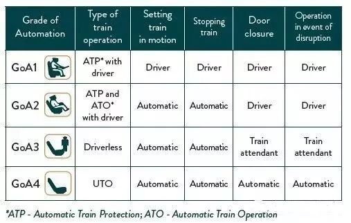 —GoA4:完全自动驾驶,列车唤醒、休眠、启动、停止、车门的开闭、以及紧急情况下的列车运行全部为自动驾驶,不需要任何一名工作人员参与。