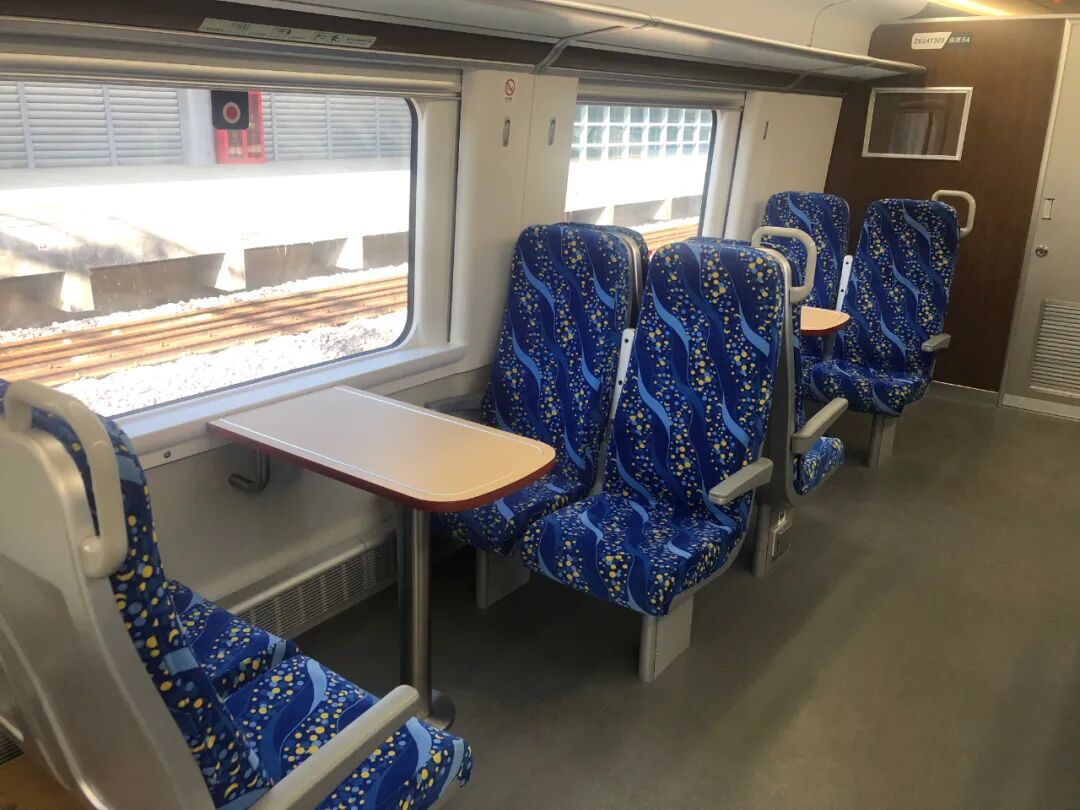 车厢设施也相当人性化。座椅下方配有充电插座,方便乘客使用。沿过道的外侧座椅设置了供抓握的扶手。其中一节车厢还采用了对向式座椅,并设有茶餐桌,旅客在车内办公或休闲都更惬意,提升出行体验。