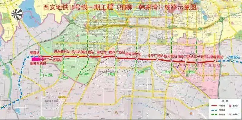 地铁15号线一期工程西起细柳站,东至韩家湾站,是横贯我市主城区南部的一条骨干线,该线路串联了高新、长安、航天三个区域,线路全长约19.5千米,均为地下线,共设车站13座,与已运营的2、4号线和即将开通的6号线换乘衔接。线路计划采用A型6辆编组电客车,搭载全自动驾驶技术,每小时最高运行速度可达100公里。线路建成运营后,将极大缩短长安大学城与相邻产业园以及城区的空间距离,对促进我市南部的科创教育、文化旅游以及快速发展具有重要意义。