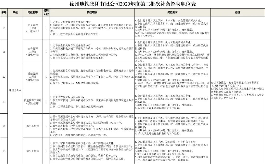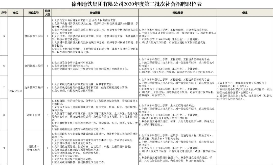一、招聘条件及需求岗位 1.自觉坚持党的领导,牢固树立“四个意识”和“四个自信”,遵守宪法和法律,积极践行社会主义核心价值观; 2.工作态度积极,具有较强的事业心、责任感; 3.身体健康,能够适应岗位工作要求; 4.招聘岗位及具体条件详见附件。 二、招聘方式 实行面试考核,具体时间另行通知。 三、报名及相关要求 1.有意参加应聘者请登陆徐州地铁官方招聘网申系统http://recruit.xzdtjt.com进行职位报名投递。 2.报名时请上传身份证、学历(学位)证书、职称证书等扫描件和近期彩色一寸免冠照片。 3.应聘者需根据岗位要求选择适合自身情况的岗位进行报名,每人只限报考一个岗位。 4.报名截止时间为2020年10月23日17:30。 四、相关说明 1.在招聘过程中,应聘者请保持所提供的通讯方式畅通。 2.资格审查贯穿招聘工作全过程,应聘者报名时提交的信息和提供的有关材料必须真实有效,凡出现以下情况者,即取消其应聘及录用资格: (1)提供虚假信息的; (2)有违法犯罪记录的; (3)因违反纪律被单位开除的; (4)被人民法院列入失信人名单的; (5)有黄、赌、毒等不良嗜好的; (6)处于精神病和传染病发病期的; (7)有其它不良行为和记录的。 3.我公司在本次招聘过程中,未委托任何机构和个人,应聘者也无须缴纳任何费用。 4.应聘者可通过电话咨询招聘相关事宜,谢绝应聘者来访。咨询电话:0516-80805211、0516-80801777。