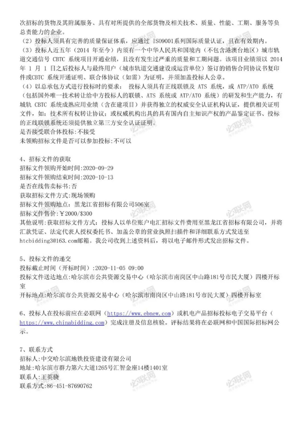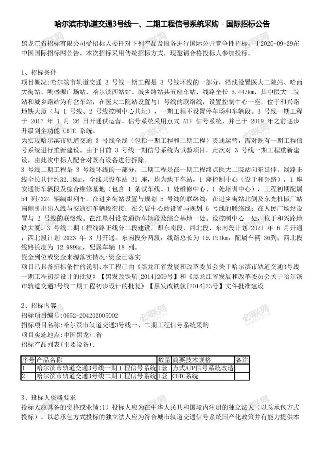 哈尔滨市轨道交通3号线一、二期工程信号系统采购国际招标公告