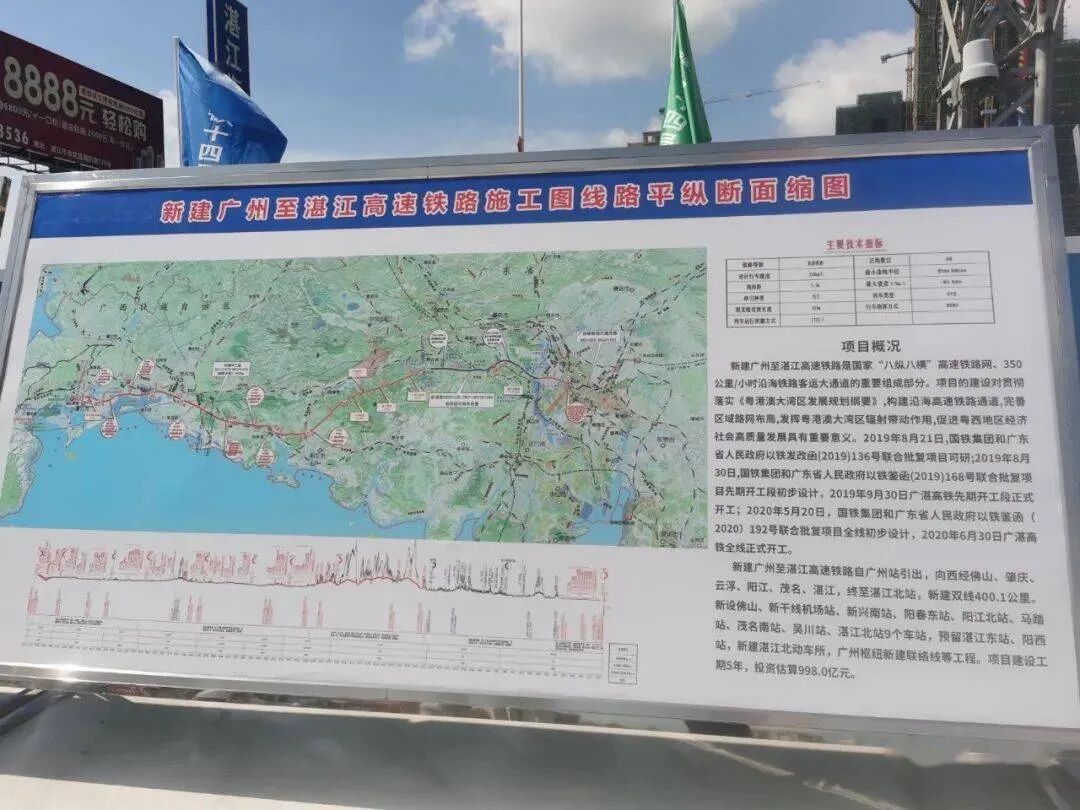 项目概况:新建广州至湛江高速铁路自广州站引出,向西经佛山、肇庆、云浮、阳江、茂名、湛江,终至湛江北站,新建双线400.1公里。新设佛山、新干线机场站、新兴南站、阳春东站、阳江北站、马踏站、茂名南站、吴川站、湛江北站9个车站,预留湛江东站、阳西站。含广州枢纽新建联络线等工程及新建湛江北动车所。
