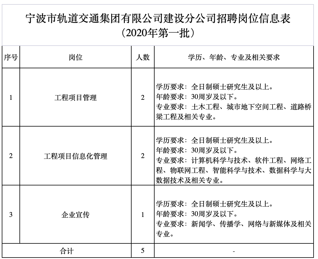 宁波市轨道交通集团有限公司建设分公司隶属于宁波市轨道交通集团有限公司,成立于2016年8月,主要负责轨道交通工程建设与管理。现因工作需要,特招聘以下岗位人员(详见附件1):
