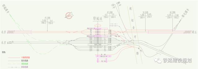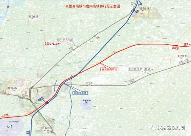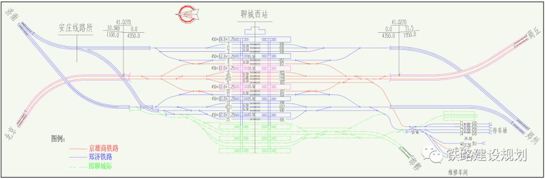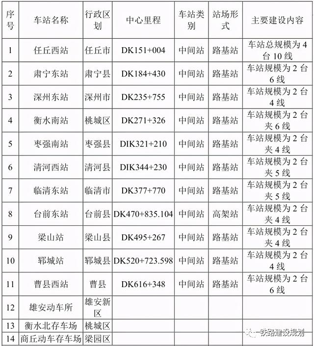 其中:雄安站为京雄城际铁路工程,商丘站为商合杭铁路工程,本项目不含;聊城西站与郑济铁路共站,菏泽东站与鲁南高铁共站;郓城站、梁山站、商丘站与既有京九铁路共站。在衡水北站设置动车组存车场,在雄安动车所实施预留工程、在商丘动车存车场新建维修工区。