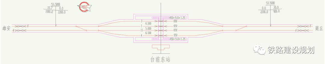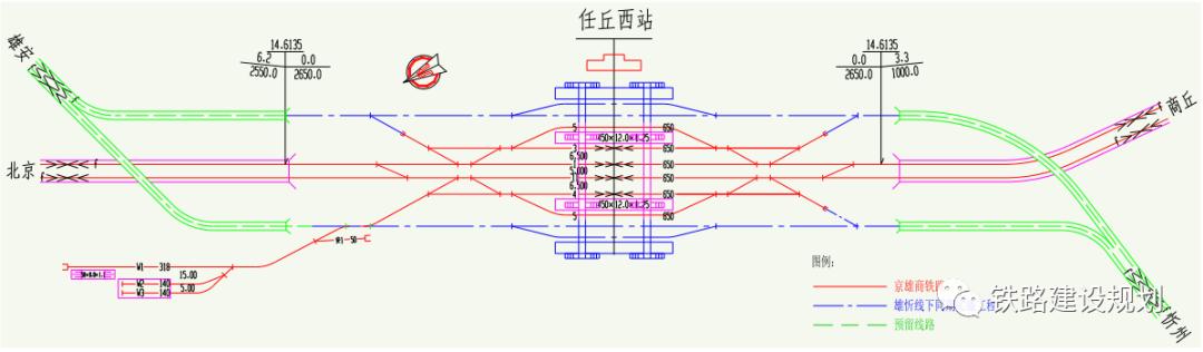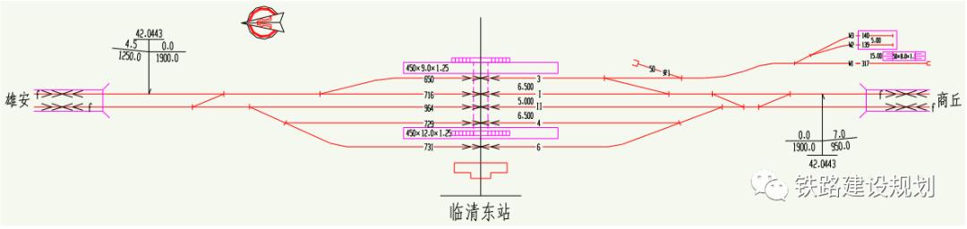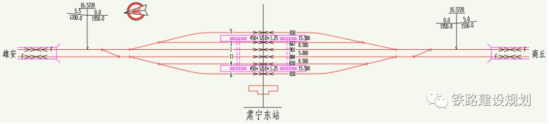 雄商场设 450×12×1.25m 岛式站台 2 座,设 8.0m 宽旅客地道 2 座。为解决津雄城际至商丘方向、北京至雄忻铁路方向跨线车交流,分别在两端咽喉区修建跨线车联络线,以 42 号道岔单渡线形式进行布置。