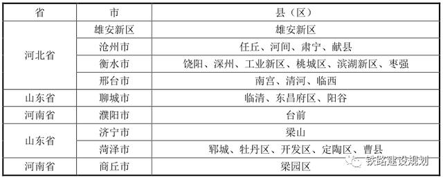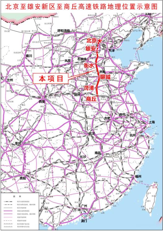 新建北京至雄安新区至商丘高速铁路雄安新区至商丘段是京港台通道的重要组成部分,线路位于京沪高速铁路、京广客运专线两大干线之间,基本沿既有京九通道,北起雄安站,向南经雄安新区、沧州市、衡水市、邢台市和山东省聊城市,在河南省濮阳市台前县跨黄河后,再经山东省济宁市、菏泽市、河南省商丘市至商合杭铁路商丘站。