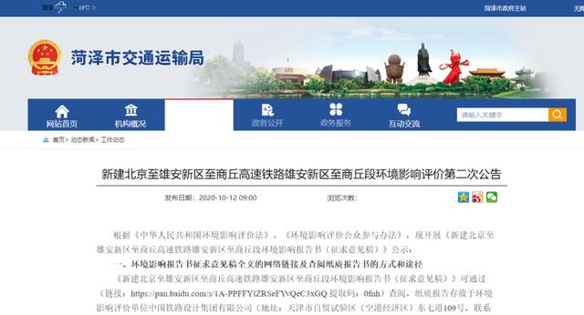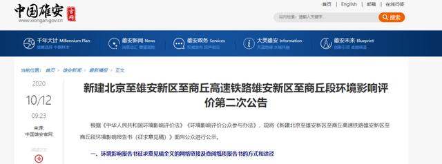 10月12日,《新建北京至雄安新区至商丘高速铁路雄安新区至商丘段环境影响评价第二次公告》在沿线各市(区)人民政府网站正式发布,线路详细走向和各车站规模、布置方案均已出炉。