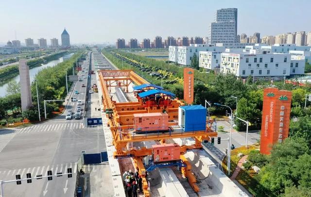 日前,滨铁2号线首联U箱组合预制悬拼节段梁在中央大道段顺利合龙。