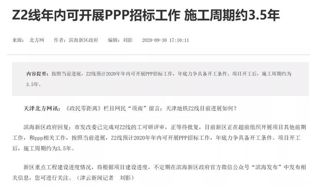 滨海新区政府回复:市发改委已完成对Z2线的工可研评审,正等待批复,目前新区正在超前组织开展项目其他前期工作,和ppp相关工作,按照当前进展,Z2线预计2020年年内可开展PPP招标工作,年底力争具备开工条件。项目开工后,施工周期约为3.5年。