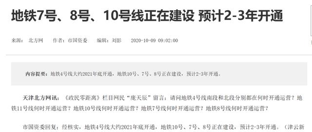 市国资委回复:经核实,地铁4号线大约2021年底开通,地铁10号、7号、8号正在建设,预计2-3年开通。