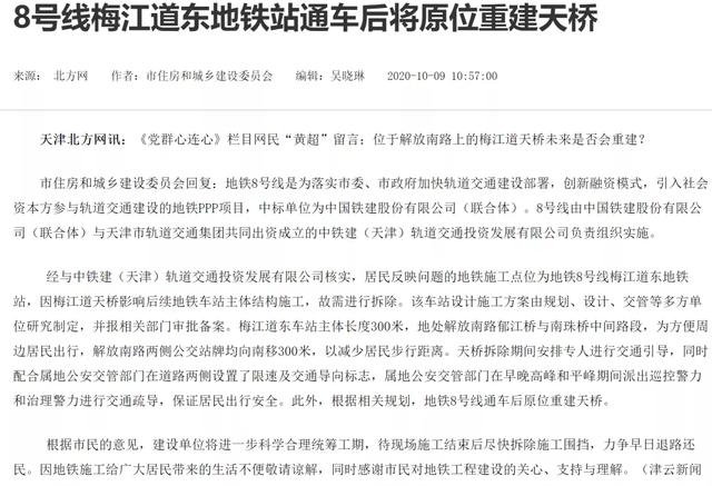 经与中铁建(天津)轨道交通投资发展有限公司核实,居民反映问题的地铁施工点位为地铁8号线梅江道东地铁站,因梅江道天桥影响后续地铁车站主体结构施工,故需进行拆除。该车站设计施工方案由规划、设计、交管等多方单位研究制定,并报相关部门审批备案。