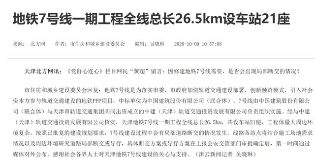 经与中建(天津)轨道交通投资发展有限公司核实,天津地铁7号线一期工程全线总长26.5km,共设车站21座,工程体量大周边环境复杂。按照已批复的建设规划要求,7号线建设过程中会有局部道路断交的情况发生。
