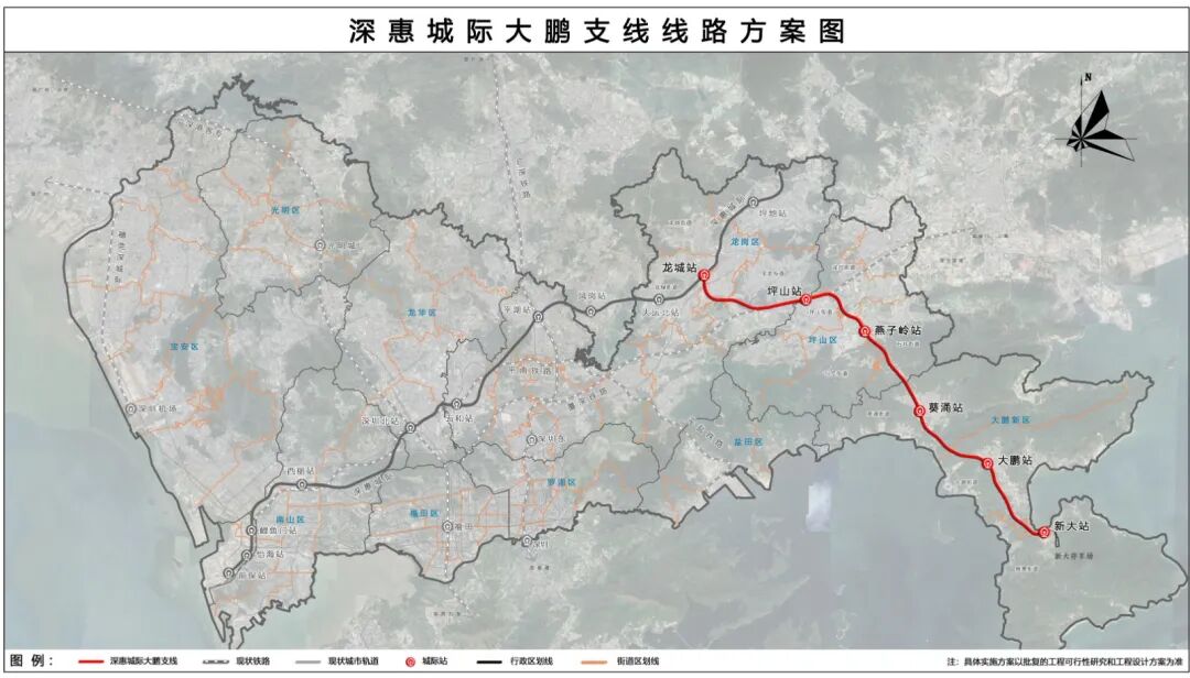 深惠城际大鹏支线主要途经龙岗中心区、坪山中心区、燕子湖片区、葵涌中心区、大鹏及新大片区。