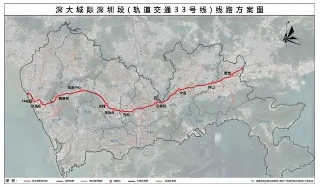 深大城际深圳段(轨道交通33号线)主要途经机场、石岩、龙华、坂田、白坭坑、大运、坪山、聚龙等地区,线路全长68.8公里。