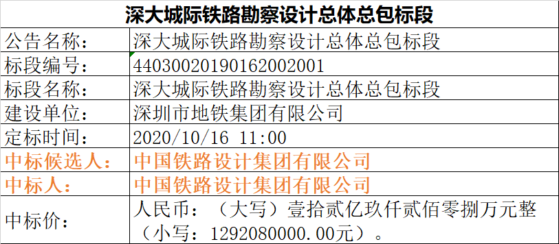 10月16日,深惠城际铁路勘察设计总体总包中标公示,中标人中铁工程设计咨询集团有限公司。中标价为11.75亿。