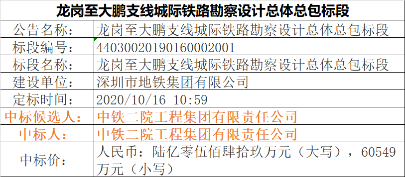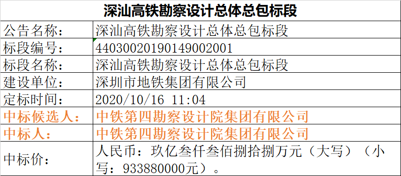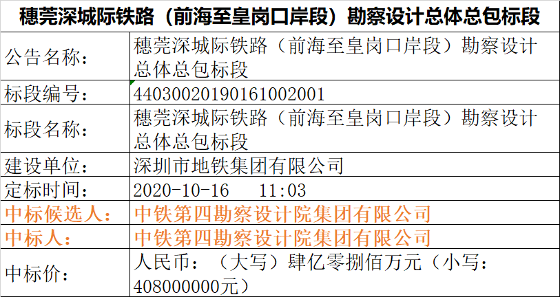 10月16日,线路勘察设计总体总包中标公示,中标人为中铁第四勘察设计院集团有限公司。中标价为4.08亿。