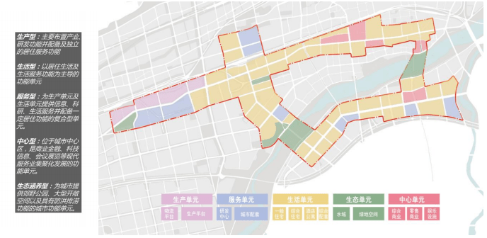 按照单元式开发,根据单元内部功能的侧重分为生产型、服务型、生活型、中心型、生态型单元。
