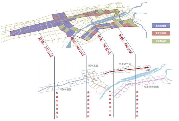 同时,根据各地块改造潜力,划分为重点设计区、重点改造区、保留整合区,重塑区域空间。