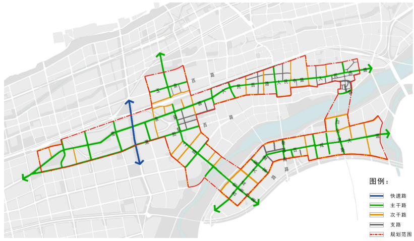 将重点考虑疏解主干道交通,规划构筑等级分明、职能合理的交通系统。规划区道路系统构成包括快速路、主干道、次干道、支路四个等级。