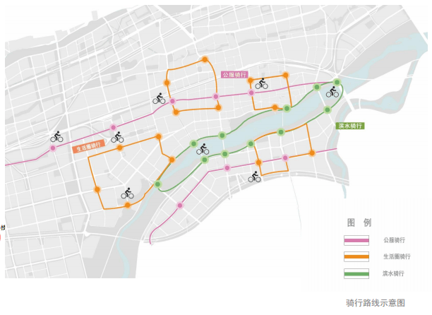 沿绿色廊道、城市公共设施和社区中心设置骑行路线,与机动车交通分离,并汇聚于各个节点区,提供安全、舒适的城市户外活动空间系统。