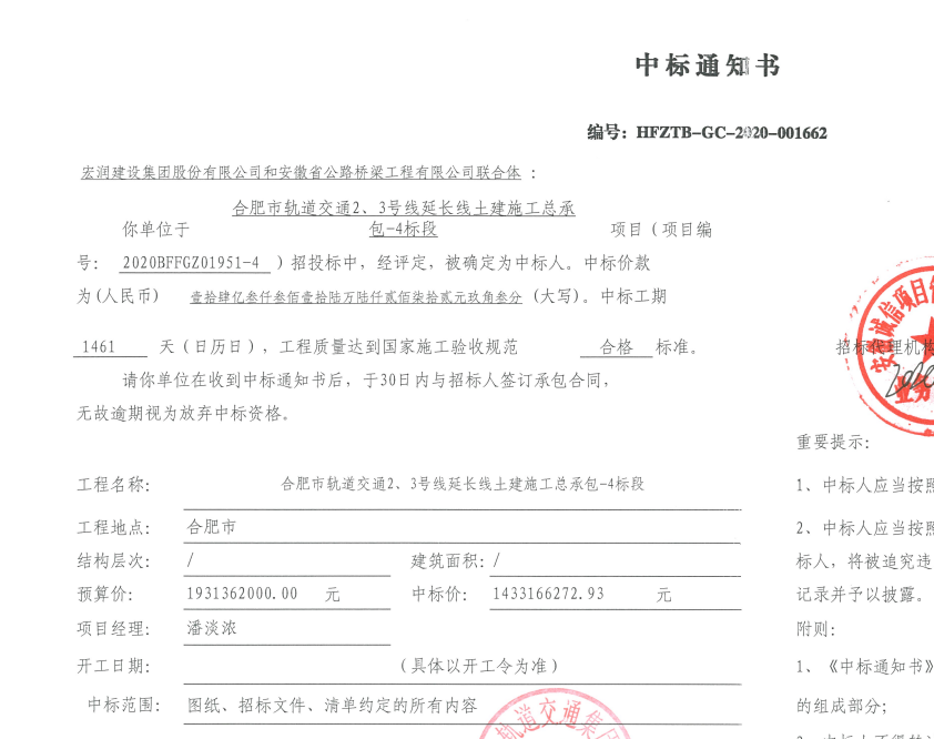 合肥市轨道交通2、3号线延长线土建施工总承包-4标段招标人(甲方):合肥市轨道交通集团有限公司中标人(乙方):宏润建设集团股份有限公司所属地域:安徽省合同金额:143316.627293万元合同签订日期:2020年10月09日合同公告日期:2020年10月13日