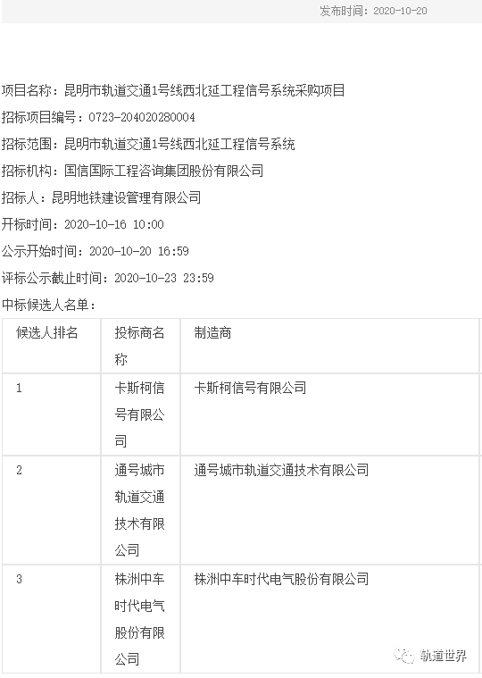 昆明轨道交通1号线西北延工程信号系统中标候选结果