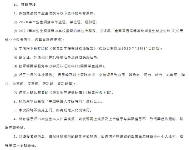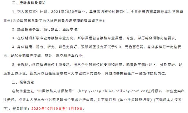 采取网上报名、资格遴选、面试考核、公示拟录用名单、签订就业协议等程序进行招聘。中国铁路哈尔滨局集团有限公司在2020年11月30日前根据岗位需要及招聘计划,分期分批遴选应聘毕业生进行面试,其中信息技术专业岗位以学校生源和教学质量较好的毕业生优先。具体面试时间、地点通过中国铁路人才招聘网发送站内消息进行告知,请应聘毕业生注意查看网上报名时填报的个人邮箱中通知消息。未按指定时间参加面试的毕业生视为自动放弃。招聘过程中,未进入下一环节的毕业生不再另行通知。