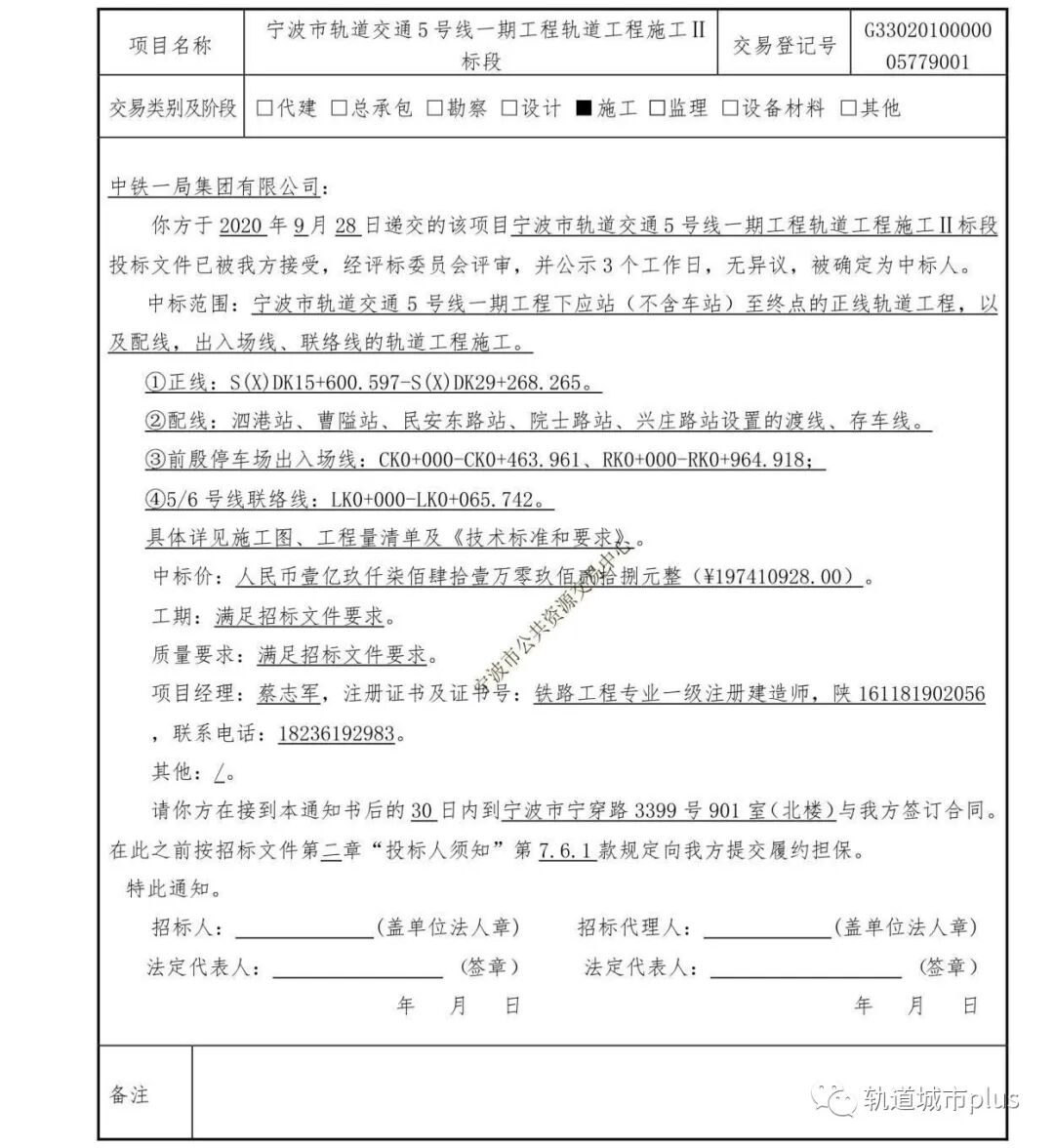 宁波市轨道交通5号线一期工程轨道工程施工001标段中标公告
